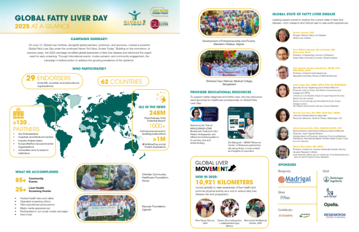 Global Fatty Liver Day, formerly known as International NASH Day, is a public education campaign that was inaugurated in June 2018 to enhance awareness and emphasize the pressing nature of fatty liver disease, particularly its advanced stages, which impacts a staggering 115 million individuals worldwide.